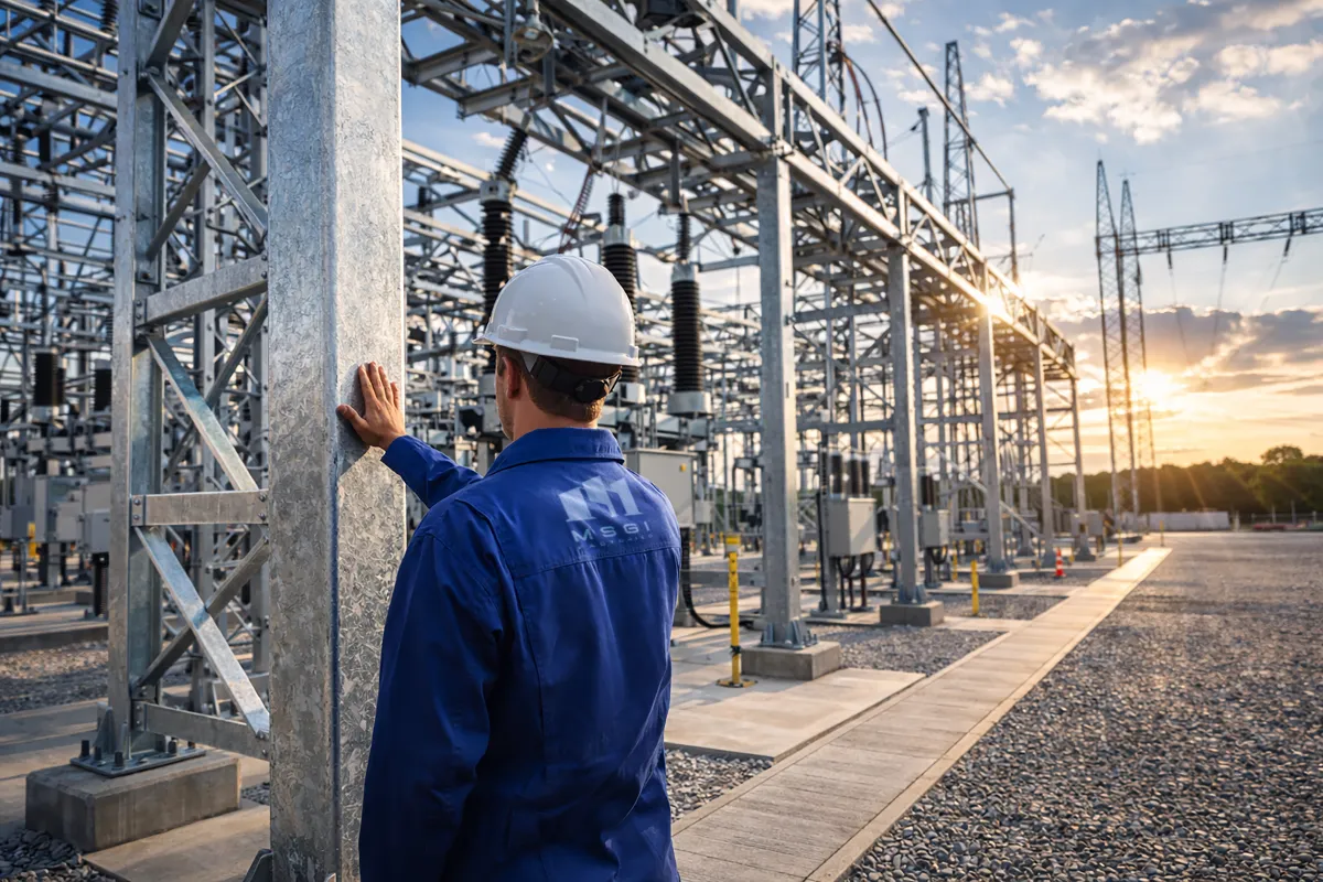 Les postes électriques sont les nœuds vitaux du réseau énergétique. MSGI fabrique l'ensemble des structures métalliques nécessaires aux sous-stations : portiques, supports d'appareillage (disjoncteurs, sectionneurs) et charpentes de bâtiments de commande.