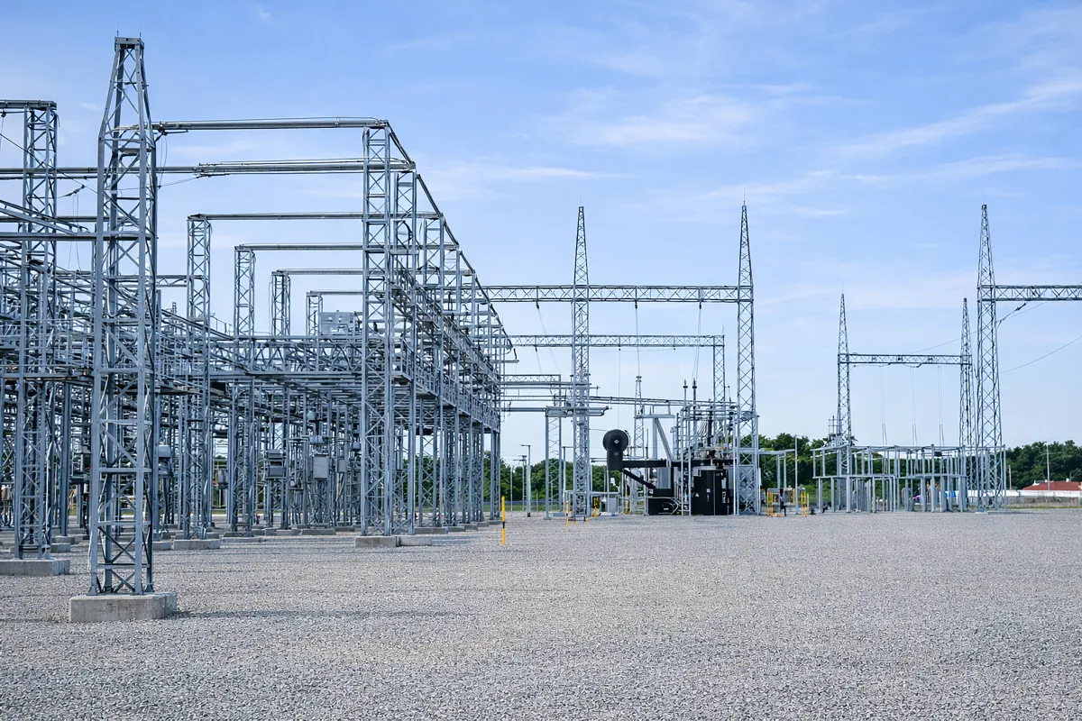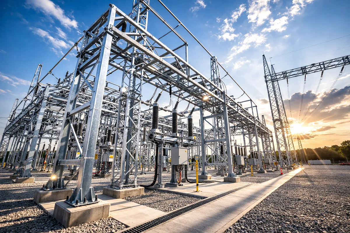 Les postes électriques sont les nœuds vitaux du réseau énergétique. MSGI fabrique l'ensemble des structures métalliques nécessaires aux sous-stations : portiques, supports d'appareillage (disjoncteurs, sectionneurs) et charpentes de bâtiments de commande.
